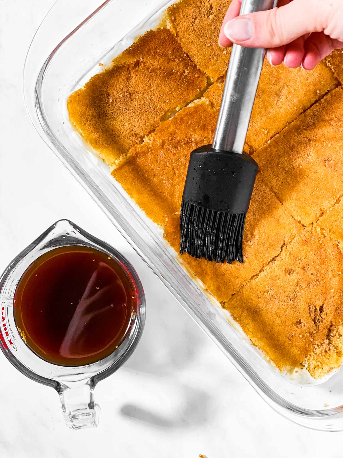 - Assemble: Spread thin layer of cream cheese mixture over bottom of ungreased 9x13 inch pan. Arrange 1/3 of cake slices in pan, making sure to leave no gaps. Brush with 1/3 of coffee mixture. Spread 1/3 of cream cheese mixture over cake.