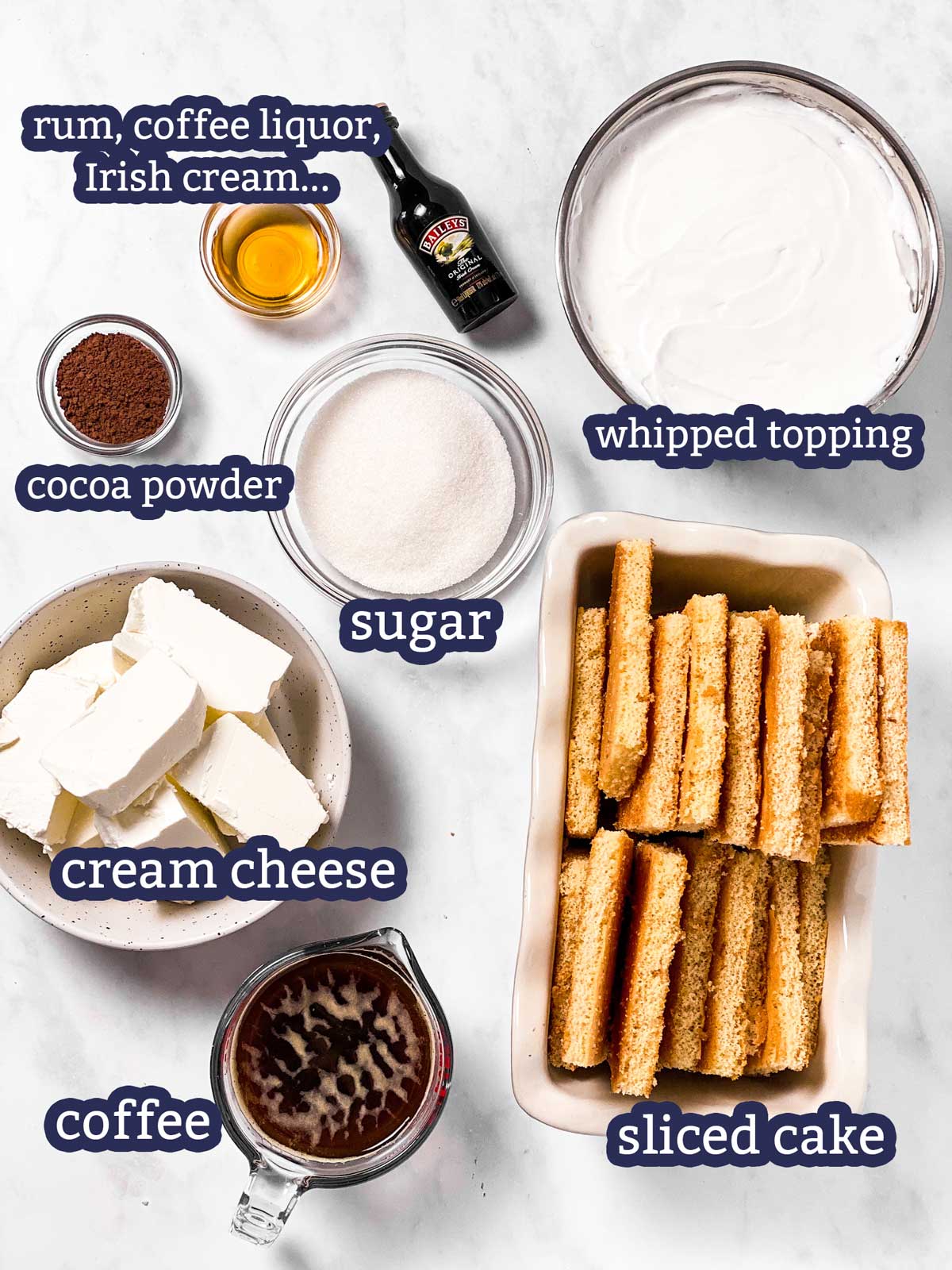 - Cake: I like pound cake or angel food the most, but you can even get away with sponge cake slices or yellow cake, white cake… Whatever you have on hand or can find at the store. If you use frozen, make sure to fully thaw the cake first, or the Tiramisu will be watery.