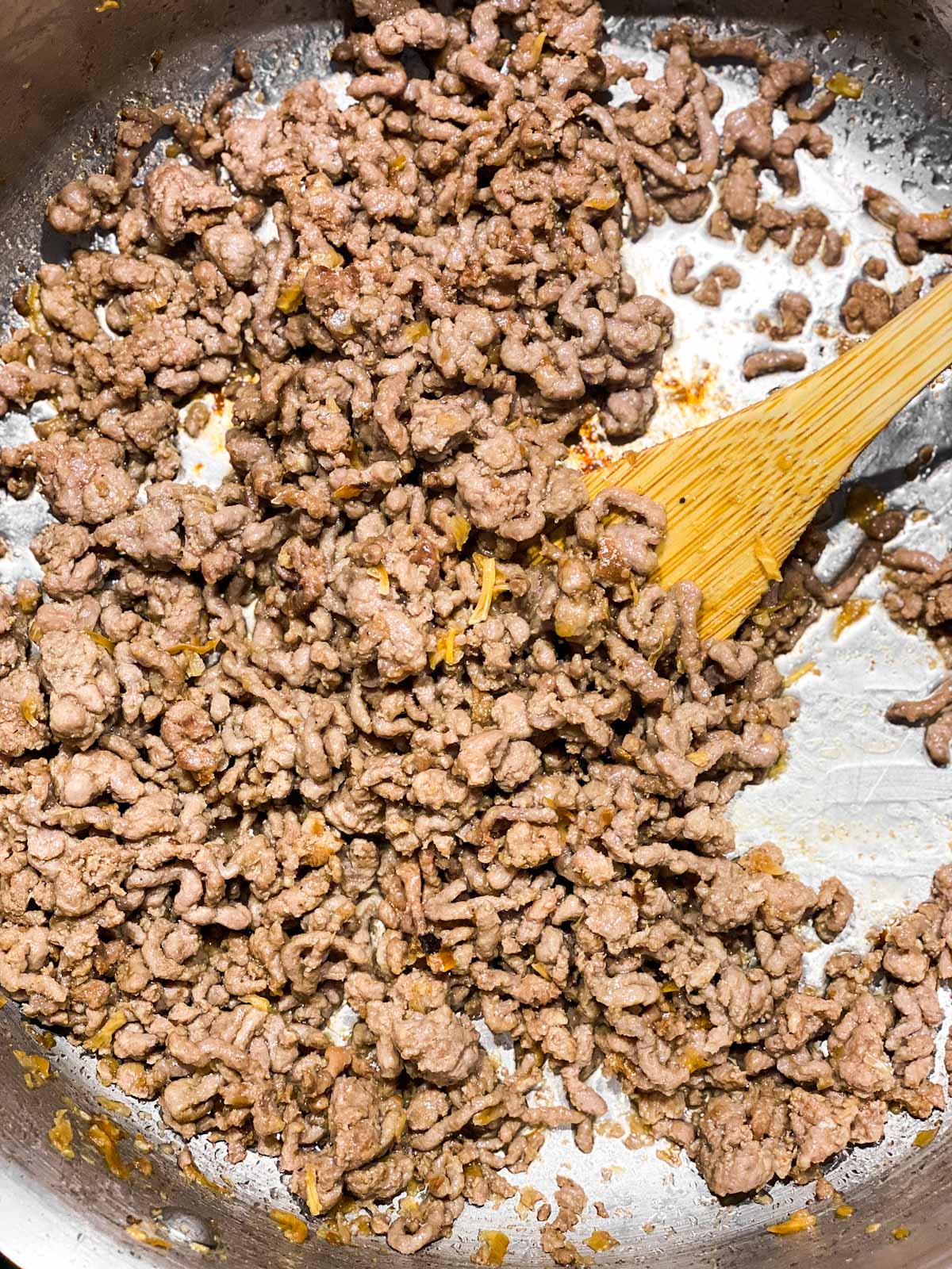 2. Once the beef is cooked, stir in 3 1/2 cups of beef broth. You’ll want to scrape any browned bits off the bottom of the pan, that’s all the flavor there.