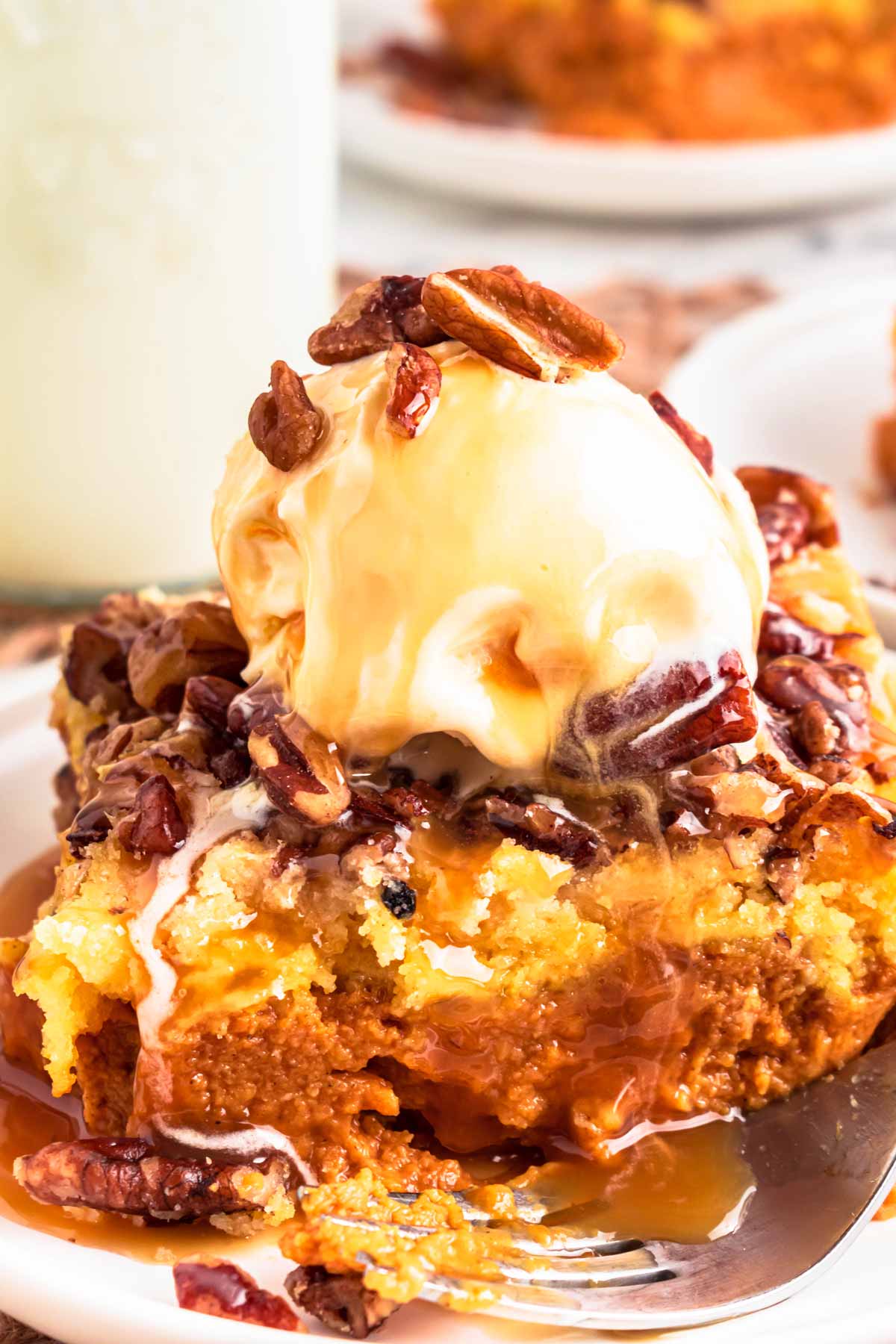 - Fall flavors everyone loves: Pumpkin spice, buttery cake, and crunchy pecans come together for a crowd-pleasing dessert.