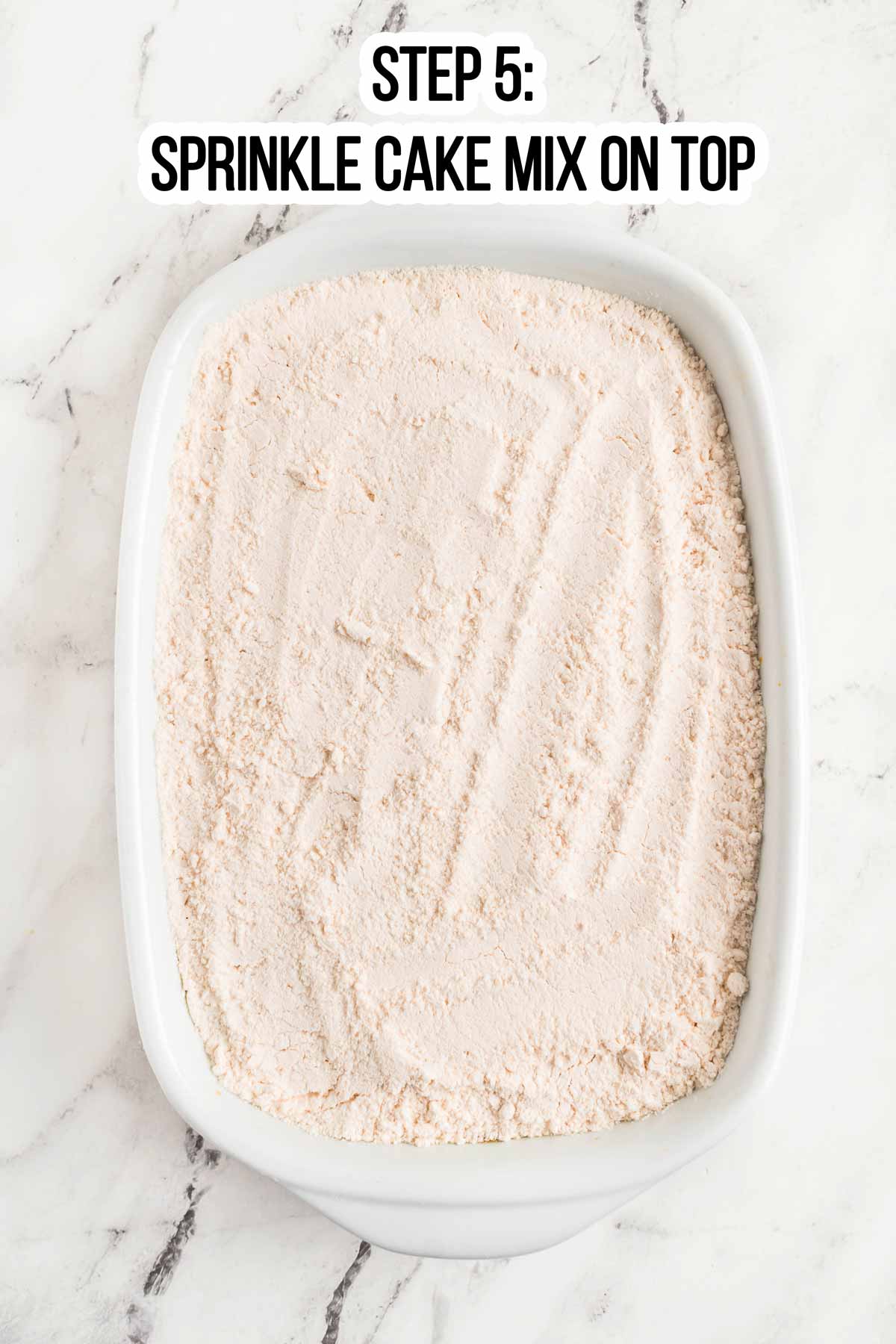 Melt and drizzle: Melt your butter (I usually pop it in the microwave for a few seconds) and pour it slowly and evenly over the cake mix layer. It’s okay if some dry spots peek through; those spots will still bake into a delicious crust.